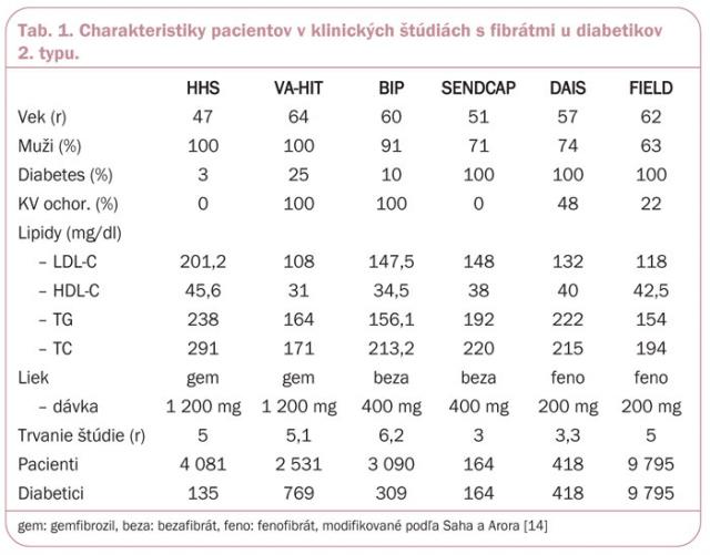 Saha a Arora [14] vykonali metaanalýzu klinických (randomizovaných) štúdii s fibrátmi u diabetikov 2. typu v prevencii KV ochorení. Sústredili sa na tieto štúdie (tab. 1):