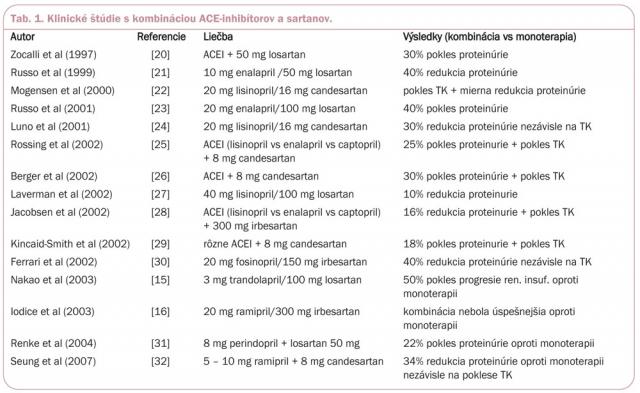Ako sme už spomínali, klinické štúdie s viacerými blokátormi AT1 receptorov (hlavne s irbesartanom) potvrdili ich účinnosť v prevencii a redukcii mikroalbuminúrie a proteinúrie u pacientov s 2. typom diabetu. Neodpovedali však na otázky, či sú sartany rovnako alebo viac účinné v prevencii progresie renálnej insuficiencie ako ACE-inhibítory, resp. či ich kombinácia s ACE-inhibítormi má vyššiu účinnosť než monoterapie. Počet klinických štúdií porovnávajúcich efektivitu kombinácie ACE-inhibítorov a blokátorov AT1 receptorov s príslušnými monoterapiami u pacientov s rôznymi renálnymi ochoreniami začal narastať po roku 2000 (tab. 1). Tieto štúdie vzhľadom na svoj rozsah nemohli sledovať dlhodobý vývoj renálneho ochorenia, ale pri väčšine z nich došlo k redukcii proteinúrie, ktorá bola výraznejšie redukovaná pri použití kombinovanej liečby oproti príslušným monoterapiám. Niekedy sa význam kombinácie ACE-inhibítorov a sartanov u pacientov s renálnymi ochoreniami spochybňuje výsledkami štúdie ONTARGET, ktorá sledovala dodatočnú orgánovú protekciu po pridaní telmisartanu k ACE-inhibítoru ramiprilu u pacientov s artériovou hypertenziou [33]. V tejto štúdií sa ukázal byť telmisartan rovnako účinný a lepšie tolerovaný ako ramipril, avšak kombinácia telmisartanu a ramiprilu nepreukázala dodatočnú orgánovú protekciu u pacientov s nefropatiou z dôvodov limitácie samotnej štúdie. Dôvodov, prečo kombinácia ramipril a telmisartan v tejto štúdii nebola a ani nemohla byť u pacientov s nefropatiou účinnejšia ako monoterapia, je hneď niekoľko [17]. Uvedieme len tie najdôležitejšie: