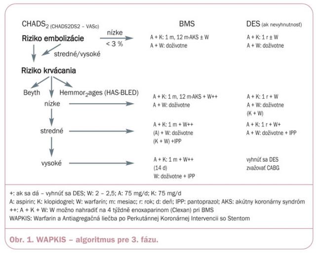 V našej každodennej praxi vyššie spomínané body tzv. konsenzu uplatňujeme tri roky s akceptovateľným klinickým dopadom riziko/benefit. Ako sme už uviedli aj v našom súbore chorých (WAPKIS) vyžadujúcich W + A + K liečbu, jasne prevláda indikácia W pre FP. Pri novovzniknutej FP postupujeme nateraz pri barmetalovom (BM) stente nasledovne: