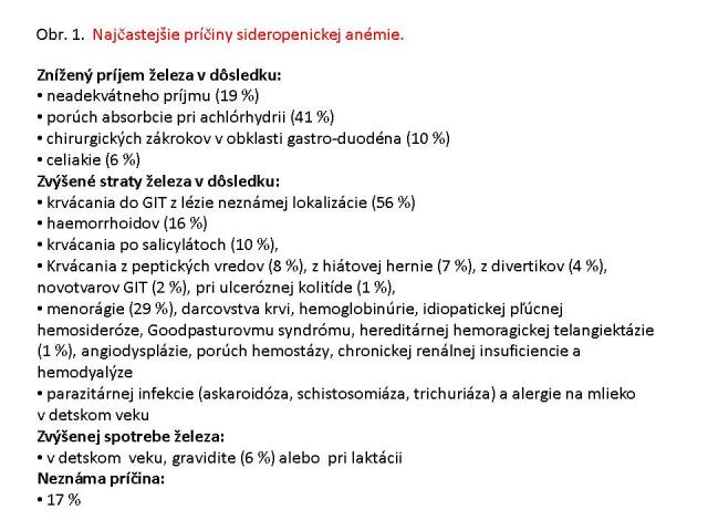 Svetová zdravotnícka organizácia definuje anémiu poklesom koncentrácie hemoglobínu na hodnoty < 130 g/L (13 g/dl) u mužov starších ako 15 rokov, na hodnoty < 120 g/L (12 g/dl) u negravidných žien starších ako 15 rokov a na hodnoty < 110 g/L (11 g/dl) u žien gravidných [1]. Jej rôzne stupne klinickej závažnosti sú diagnostikované u 20 – 40 % všetkých hospitalizovaných pacientov [2]. Sideropenická anémia sa radí do širšej skupiny hypochrómnych anémií a jej príčinou je relatívny alebo absolútny nedostatok železa. Sideropénia je príčinou približne 50 % všetkých anémií.