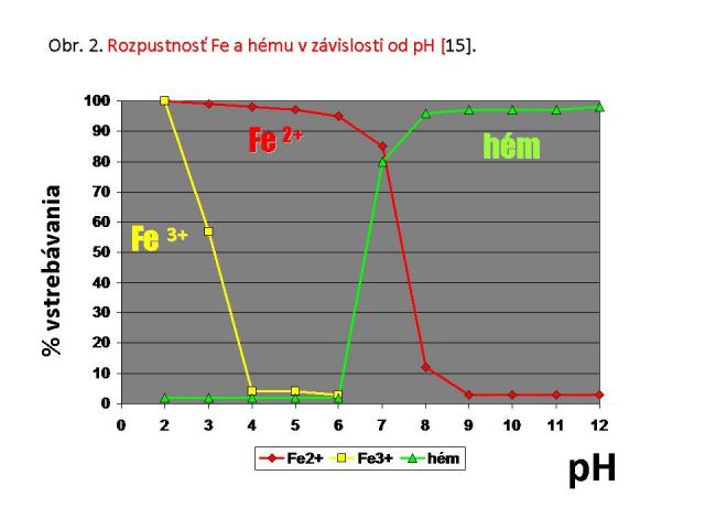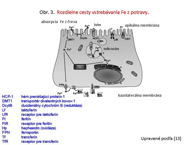 Väčšina v potrave obsiahnutého anorganického železa sa vyskytuje v 3-mocnej forme, ktorá je rozpustná len v silne kyslom prostredí a ktorej rozpustnosť klesá so stúpajúcim pH. Preto sa 3-mocné železo vstrebáva len v kyslom prostredí žalúdka, ale v alkalizujúcom sa prostredí dvanástorníka je prakticky biologicky nedostupné (obr. 2) [15]. Navyše – ako vysoko reaktívna forma železa rýchlo reaguje s rôznymi súčasťami chýmu. K tomu, aby sa mohlo trojmocné železo vstrebať, musí byť redukované na 2-mocnú formu účinkom reduktázy: duodelnálnym cytochrómom B (DcytB). Až po tejto „úprave“ je aktívne internalizované pomocou transportéra divalentných kovov-1 (DMT-1). Vnútri enterocytu je buď uschované ako zásobné železo vo forme feritínu po celú dobu života enterocytu (cca 3 dni) a následnou deskvamáciou sa pri zníženej potrebe vylúči, alebo – pri zvýšenej potrebe organizmu – je transportované k bazálnemu pólu enterocytu cytoplazmatickým transportérom ferroportín (FPN). Na to, aby mohlo byť opäť využité v organizme, musí sa opäť oxidovať na trojmocnú formu účinkom oxidázy hephaestínu (Hp) a až také môže byť ďalej transportované transferínom (obr. 3).