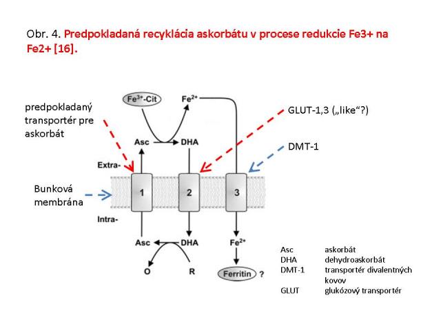 Kľúčovú úlohu nielen v resorpcii, ale aj biologickej dostupnosti a využitia všetkých foriem železa v organizme, má kyselina askorbová. Keďže sa vitamín C netvorí v ľudskom organizme, jeho dostupnosť závisí od exogénneho prívodu a z hľadiska jeho vplyvu na vstrebateľnosť železa je kľúčová jeho prítomnosť na luminálnom póle enterocytu, resp. v lumine čreva. Askorbát priamo ovplyvňuje aktivitu DcytB, čím reguluje dostupnosť vstrebateľnej formy Fe2+. Askorbát slúži ako donor 2 elektrónov pri redukcii Fe3+ na Fe2+ účinkom DcytB, pričom samotný sa oxiduje na dehydroaskorbát (DHA). K tomu, aby sa mohol opäť zapojiť do oxid-redukčného cyklu, musí sa opäť redukovať účinkom intracelulárne dostupných red-oxmechanizmov. Preto dochádza k internalizácii DHA pomocou transportérov, ktoré sú pravdepodobne identické s GLUT-1 a GLUT-3 pre glukózu. Po regenerácii je askorbát opäť externalizovaný a zapojený do cyklu DcytB (obr. 4) [16]. Novším poznatkom je možnosť priamej tvorby komplexu samotného askorbátu s Fe3+ a aktívneho transmembránového transportu tohto komplexu Fe-askorbát [14,17]. Askorbát okrem toho mobilizuje železo z jeho kryštalickej formy obsiahnutej vo feritíne, aktivuje jeho mobilizáciu cestou zvýšenej aktivácie IRP-1 a IRP-2, brzdí degradáciu feritínu a jeho transformáciu na hemosiderín s ťažšie mobilizovateľnými zásobami železa, ale efektívne mobilizuje aj tkanivové železo pri hemosideróze sprevádzajúcej na erytropetín rezistentnú anémiu pri chronickej renálnej