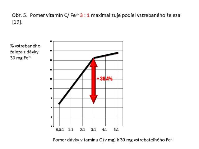 insuficiencii [18,19]. Z farmakologických štúdii vyplýva, že optimálny pomer askorbátu k železu, zabezpečujúci maximálnu resorpciu elementárneho železa, je 3 : 1. Ten sa v praxi empiricky dosahuje perorálnou suplementáciu askorbátu v dávke 200 – 900 mg/deň. Denná dávka askorbátu viac ako 200 mg denne zvyšuje vstrebávanie železa z podanej dávky o viac ako 1/3 [5,12,15–17,20–22] (obr. 5). Hore uvedené možné mechanizmy transportu akcentujú význam nielen celotelových zásob askorbátu, ale aj dôležitosť jeho aktuálneho črevného intraluminálneho poolu najmä v dobe terapie.