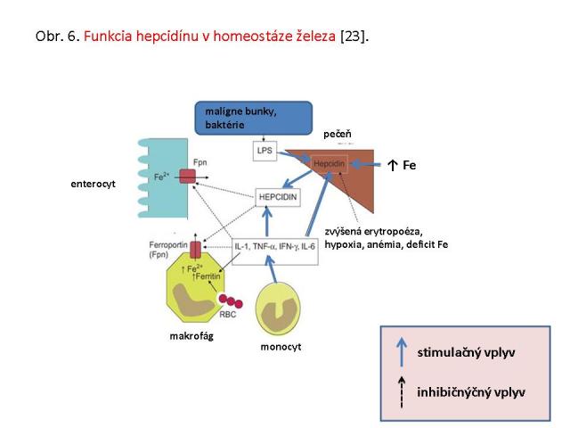 Ďalším významným regulátorom obratu železa v organizme je hepcidín. Hepcidín je peptid tvorený 25 aminokyselinami prevažne v pečeni a pôvodne bol identifikovaný ako pôsobok s antimikrobiálnym účinkom (LEAP-1: liver-expressed antimicrobial peptide-1) [23]. Výskum v poslednej dekáde ukázal, že hepcidín je kľúčovým regulátorom nielen črevnej absorbcie železa v enterocytoch dvanástorníka, ale aj jeho mobility v retikulo-endotelovom systéme priamym inhibičným účinkom na ferroportín hepatocytov a makrofágov. Fetálny hepcidín reguluje transplacentárny prenos železa z tela matky. Jeho zvýšené koncentrácie pri onkologických ochoreniach a chronických zápalových stavoch sa podieľajú na dysregulácii erytropoézy a na sideropenickej, resp. sideroachrastickej anémii, sprevádzajúcej často tieto ochorenia (obr. 6). Syntézu hepcidínu indukuje najmä nadbytok železa, cytokíny IL-6. TNF-α, IFN-γ, v menšej miere IL-2, ako aj membránové lipopolysacharidy baktérií. Inhibičný vplyv má hypoxia, anémia, deficit železa a stimulovaná erytropoéza. Nedostatočná syntéza hepcidínu sa vyskytuje pri rôznych formách hereditárnej hemochromatózy, kde sa spolu s inými defektmi podieľa na rozvoji a progresii ochorenia.