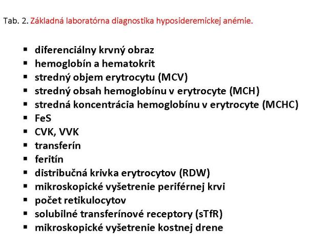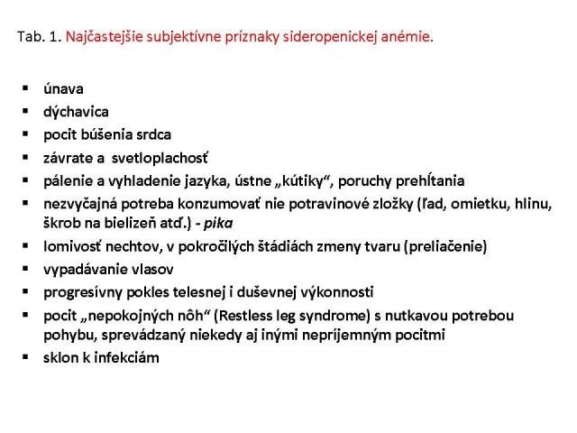 Klinické príznaky nedostatku železa v organizme sa prejavia až po vyčerpaní všetkých kompenzačných mechanizmov organizmu anemickým syndrómom. Najčastejšie subjektívne príznaky sú v tab. 1. Laboratórna diagnostika sa opiera o nález mikrocytovej anémie s rôznym stupňom hypochrómie, anizocytózy, často s reaktívnou trombocytémiou a niekedy prítomnou neutropéniou a zvýšenou segmentáciou jadier neutrofilov. Sérové železo je znížené, celková väzobná kapacita zvýšená, saturácia transferínu a koncentrácia feritínu sú znížené, dochádza k vzostupu koncentrácie solubilných sérových transferínových receptorov (sTfR). V nátere z kostnej drene sa zisťuje pokles zásobného železa a normoblastov s obsahom nehémového železa (tab. 2).