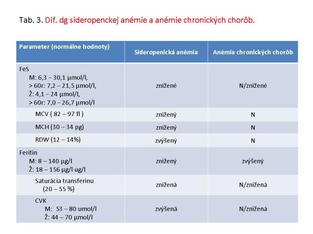 Keďže najčastejšou príčinou sideropenickej anémie sú zvýšené chronické krvné straty, kľúčovou úlohou je identifikovať ich príčinu, čo si často vyžaduje interdisciplinárny prístup. Mikrocytárna hypochrómna anémia môže byť často prvým príznakom chronického ochorenia, kde sa však uplatňuje sideroachrastický mechanizmus, resp. ich kombinácia (tab. 3).