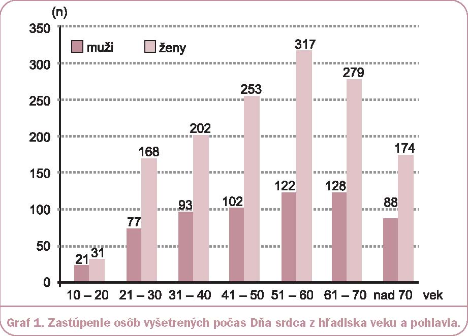 Počas Dňa srdca sa v 63 lekárňach zúčastnilo na vyšetrení 2 055 osôb, u ktorých boli zaznamenané relevantné výsledky odoslané na vyhodnotenie. Medzi vyšetrovanými osobami mali jednoznačnú prevahu ženy, ktorých bolo medzi vyšetrovanými osobami 1 424 (t.j. 69 %). Prehľad zastúpenia vyšetrených osôb podľa veku a pohlavia uvádza graf 1.