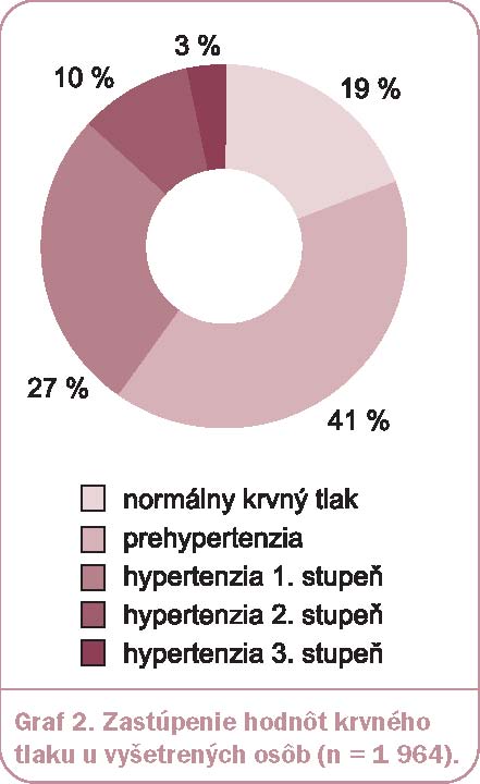 Hodnoty krvného tlaku boli získané od 1 964 osôb a ich zastúpenie uvádza graf 2. Z grafu vyplýva, že 19 % zaznamenaných hodnôt krvného tlaku spadalo do pásma normálneho krvného tlaku (sTK < 120/80), 41 % do pásma prehypertenzie (sTK 120 – 139 alebo dTK 80 – 89) a 40 % do pásma hypertenzie (sTK ≥ 140 alebo dTK ≥ 90). Nemožno, samozrejme v tejto súvislosti, hovoriť o relevantných hodnotách z hľadiska diagnostiky hypertenzie, no tieto hodnoty naznačujú, že u veľkej časti návštevníkov lekární si hodnota krvného tlaku zaslúžila pozornosť z hľadiska ďalšieho monitorovania či už v lekárni alebo v prípade potreby u príslušného lekára. Podľa formulára k vyšetreniam 1 154 vyšetrovaných osôb uviedlo, že nemá diagnostikovanú hypertenziu ani žiadne ďalšie kardiovaskulárne ochorenie. Z týchto osôb malo 25 % hodnoty v pásme hypertenzie, pričom 222 osôb (19 %) malo hodnoty krvného tlaku v pásme hypertenzie 1. stupňa (sTK 140 – 159 alebo dTK 90 – 99) a 74 osôb (6 %) hodnoty v pásme hypertenzie 2. stupňa alebo 3. stupňa (sTK ≥ 160 alebo dTK ≥ 100). Týmto osobám s potenciálnym rizikom rozvoja hypertenzie bolo odporúčané monitorovanie krvného tlaku a návšteva lekára, ktorý by následne stanovil alebo vylúčil diagnózu hypertenzie.