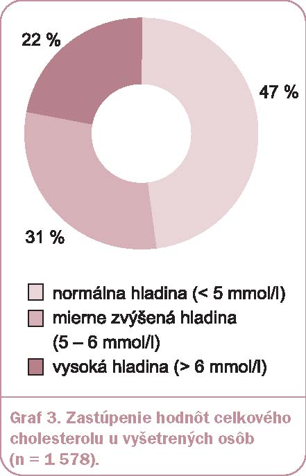 Hodnoty koncentrácie celkového cholesterolu v kvapke kapilárnej krvi boli získané od 1 578 osôb. Zastúpenie týchto hodnôt uvádza graf 3. Z grafu vyplýva, že 47 % zaznamenaných hodnôt spadalo do pásma normálnej hladiny celkového cholesterolu (< 5 mmol/l), 31 % do pásma mierne zvýšenej hladiny (5 – 6 mmol/l) a 22 % do pásma vysokej hladiny cholesterolu (> 6 mmol/l). Vysokú hladinu cholesterolu malo nameranú 195 osôb z celkového počtu 991 (t.j. 20 %), ktoré podľa formulára nemali diagnostikované žiadne kardiovaskulárne ochorenie a neužívali ani lieky na zníženie hladiny cholesterolu. Týmto potenciálnym pacientom bola taktiež odporúčaná návšteva lekára.