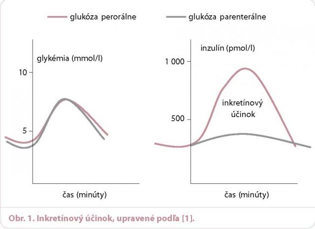 Na základe fyziologických štúdií je dokázané, že po perorálne podanej glukóze je zvýšenie inzulínovej sekrécie oveľa výraznejšie než po podaní glukózy intravenózne. Tento fenomén sa nazýva inkretínový účinok (efekt) (obr. 1).