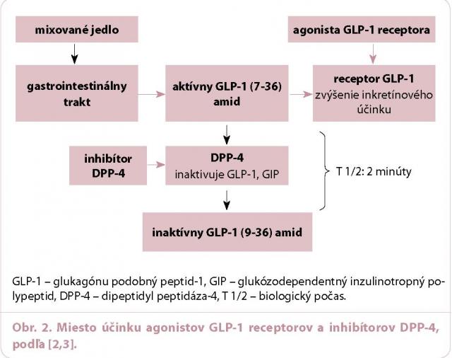 b) Inhibítory dipeptidylpeptidazy‑ 4 (iDDP‑4) vedú k zabráneniu enzymatickém degradácie endogénneho GLP‑1 pôsobením DPP‑ 4 (obr. 2). Vplyvom iDPP‑ 4 dochádza ku zvýšeniu hladín endogénneho GLP‑1 vo fyziologickom rozmedzí. Účinok iDPP‑ 4 je tiež sprostredkovaný cez GLP‑1 receptor. Plnohodnotný efekt iDPP‑ 4 je viazaný na prítomnosť dostatočnej sekrécie vlastného GLP‑1.Okrem toho iDPP‑ 4 zvyšujú hladiny ďalších peptidov, ktoré môžu mať vazoaktívny a pravdepodobne aj kardiálny účinok: natriuretický peptid B (BNP), neuropeptid Y, peptid YY, chemokín SDF 1a (stromal cell‑ derived faktor 1a) [8,9]. Porovnanie účinku GLP‑1, agonistov GLP‑1 receptorov a inhibítorov DPP‑4 je v tab. 1. V klinických štúdiách s GLP‑1 RA došlo k poklesu HbA1c o 1– 2 % DCCT a k poklesu telesnej hmotnosti (2–5 kg). Pri podávaní iDPP‑ 4 bolo zníženie HbA1c v rozsahu 0,5– 1,0 % DCCT, pričom nebol pozorovaný prírastok na hmotnosti [2].
