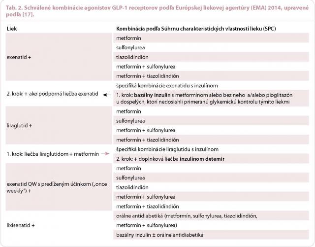 Na základe podkladov z klinických štúdií boli schválené Európskou liekovou agentúrou (EMA) indikácie a kombinácie GLP‑1 RA s inými antidiabetikami (tab. 2).