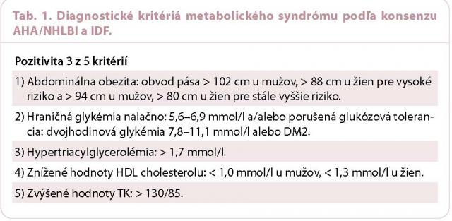 Riziko konverzie prediabetických stavov do DM2 sa využívajú rizikové skórované systémy, ktoré vypočítajú pravděpodobnost vzniku DM2 za obdobie 5–10 rokov. Skóre sa vypočítava na základe prítomnosti prediabetických stavov a ostatných komponentov metabolického syndrómu, ako aj na základe genetickej predispozície v zmysle prítomnosti DM2 u prvostupňových príbuzných. V prípade MS sa v súčasnosti najviac odporúčajú kritériá konsenzu návrhov ATPIII (AHA/NHLBI) a IDF, ktoré uvádza tab. 1 [26].